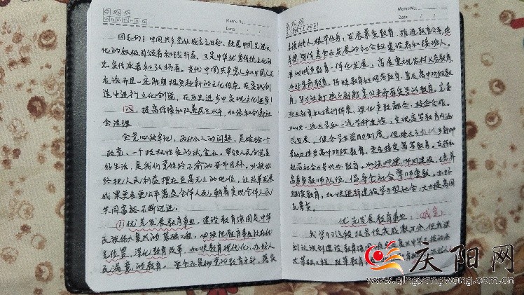 ????2017年10月18日,黨的十九大在北京開(kāi)幕,包秀梅早早起床,坐在電視機(jī)前全程觀看了大會(huì)直播。大會(huì)閉幕后,包秀梅通過(guò)村黨支部找來(lái)黨的十九大報(bào)告等資料,還托兒女為自己找來(lái)了相關(guān)報(bào)紙雜志進(jìn)行學(xué)習(xí),并在筆記上寫(xiě)下自己的感悟: