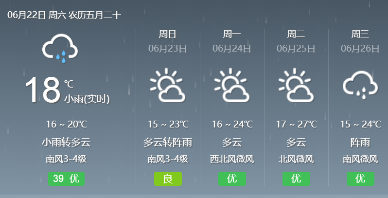 ????6月22日白天,慶陽大部將會有持續(xù)的小雨,到夜間雨晴后轉(zhuǎn)為陰間多云;