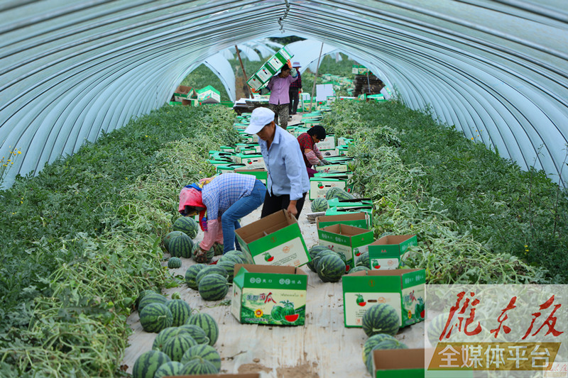 今年,開邊鎮(zhèn)在蘭溝村、開邊村、解放村建成3000畝7500個大棚的瓜菜基地。這個夏天,解放村禮品西瓜基地里的西瓜豐收了,一輛輛外地貨運大卡車在路邊排成隊,客商們正在等待西瓜裝車,村民們個個干勁十足采摘搬運西瓜。
