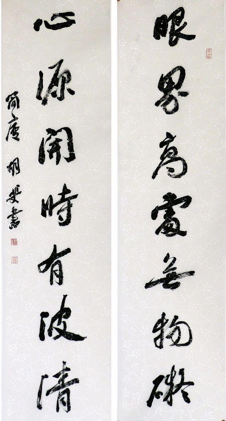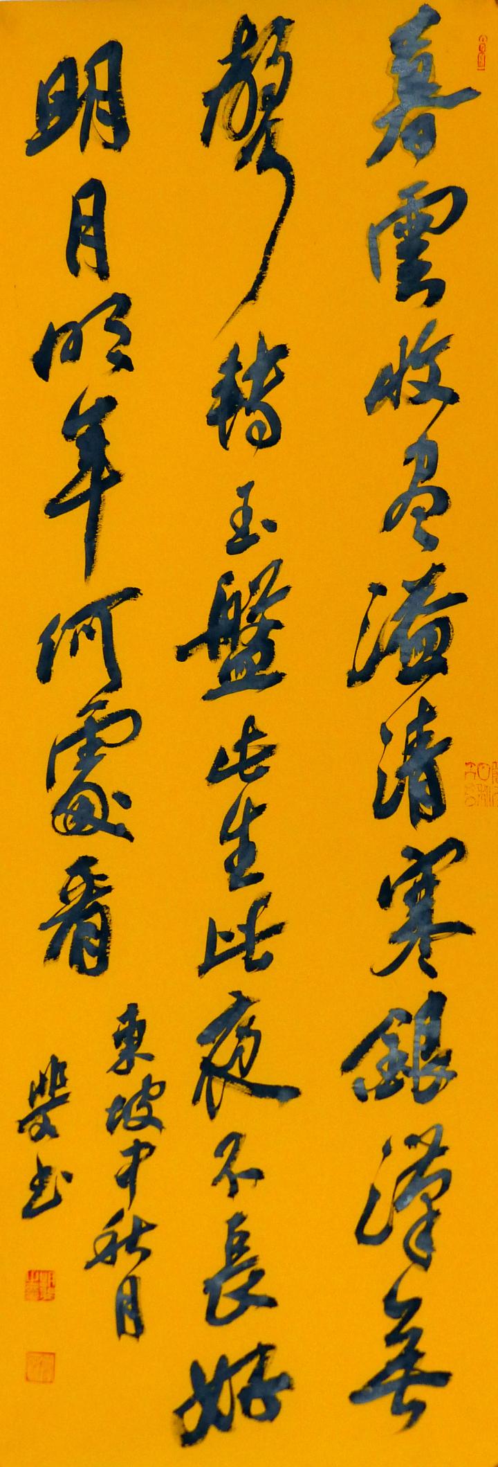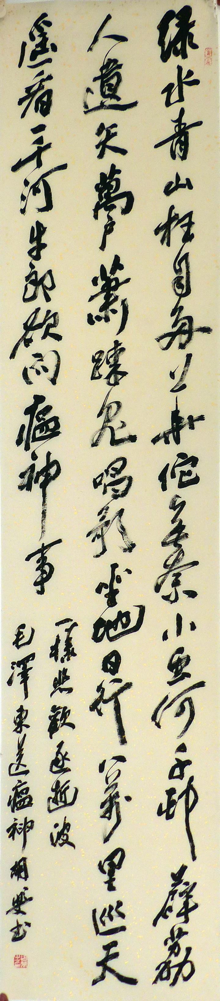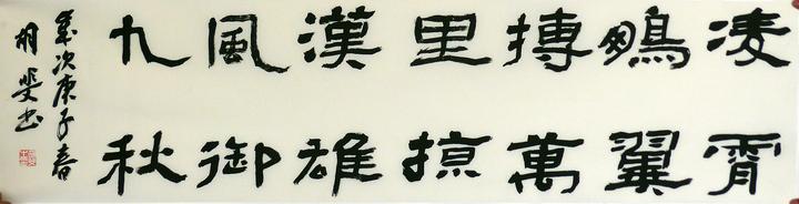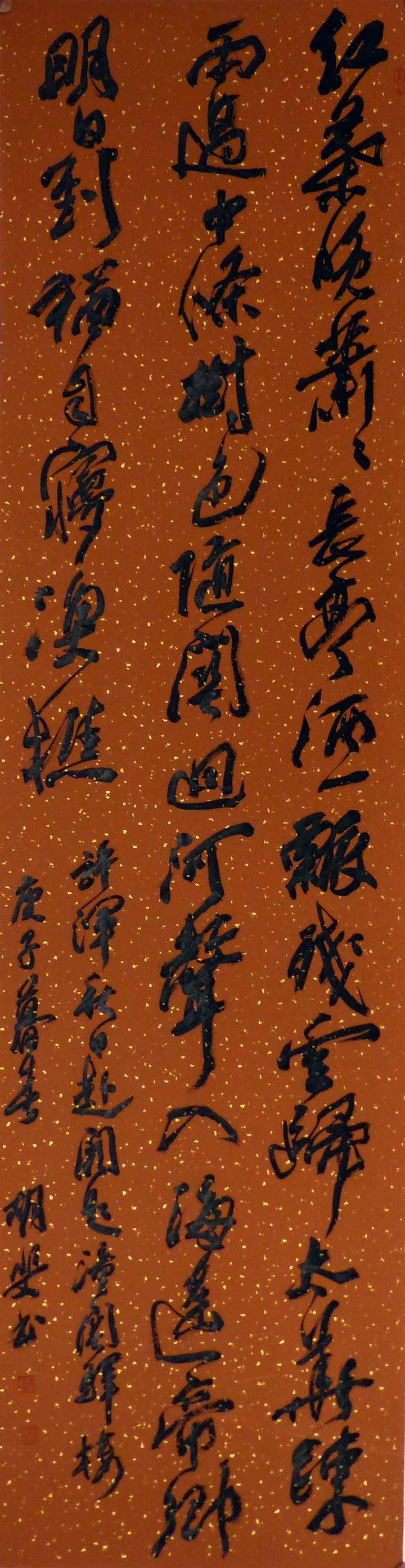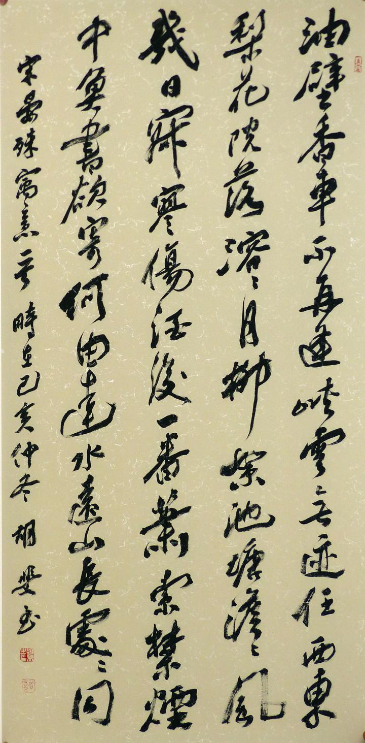 ??????? 衡量一個(gè)書法家成熟不成熟,在技法過關(guān)的前提下,最為關(guān)鍵的因素就是看他有沒有把個(gè)人的氣質(zhì)和性情融入其作品中。我們回想一下,歷史上能站得住腳的書法家,哪一個(gè)的作品不是帶著濃郁的個(gè)人氣息呢?胡斐胸中有豪情,有一股中國好漢式的英氣和硬氣。他的高明之處恰恰在于,他把這種豪情,這種英氣和這種硬氣,通過手中的毛筆表現(xiàn)在了中國式的宣紙上。胡斐的書法已經(jīng)經(jīng)過二十多年的技法訓(xùn)練和人生磨礪,逐漸呈現(xiàn)出了具有個(gè)人面目的藝術(shù)風(fēng)貌,散發(fā)出了一定的感染力。尤其是他的大幅對聯(lián)作品,裹鋒的運(yùn)用嫻熟自如,線條在沉著中透露出一股雄渾,具有強(qiáng)烈的震撼力量。他的條幅作品揮灑的成分很大,變化極為豐富,用筆和墨法都很講究,沒有制作的成分,創(chuàng)作的意思很明顯。從這個(gè)角度來看,就很容易把胡斐同當(dāng)下的制作型書法家區(qū)分開來了。