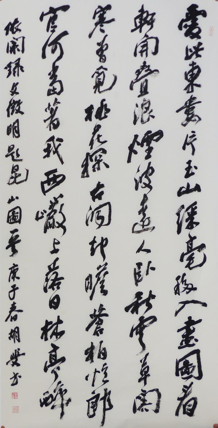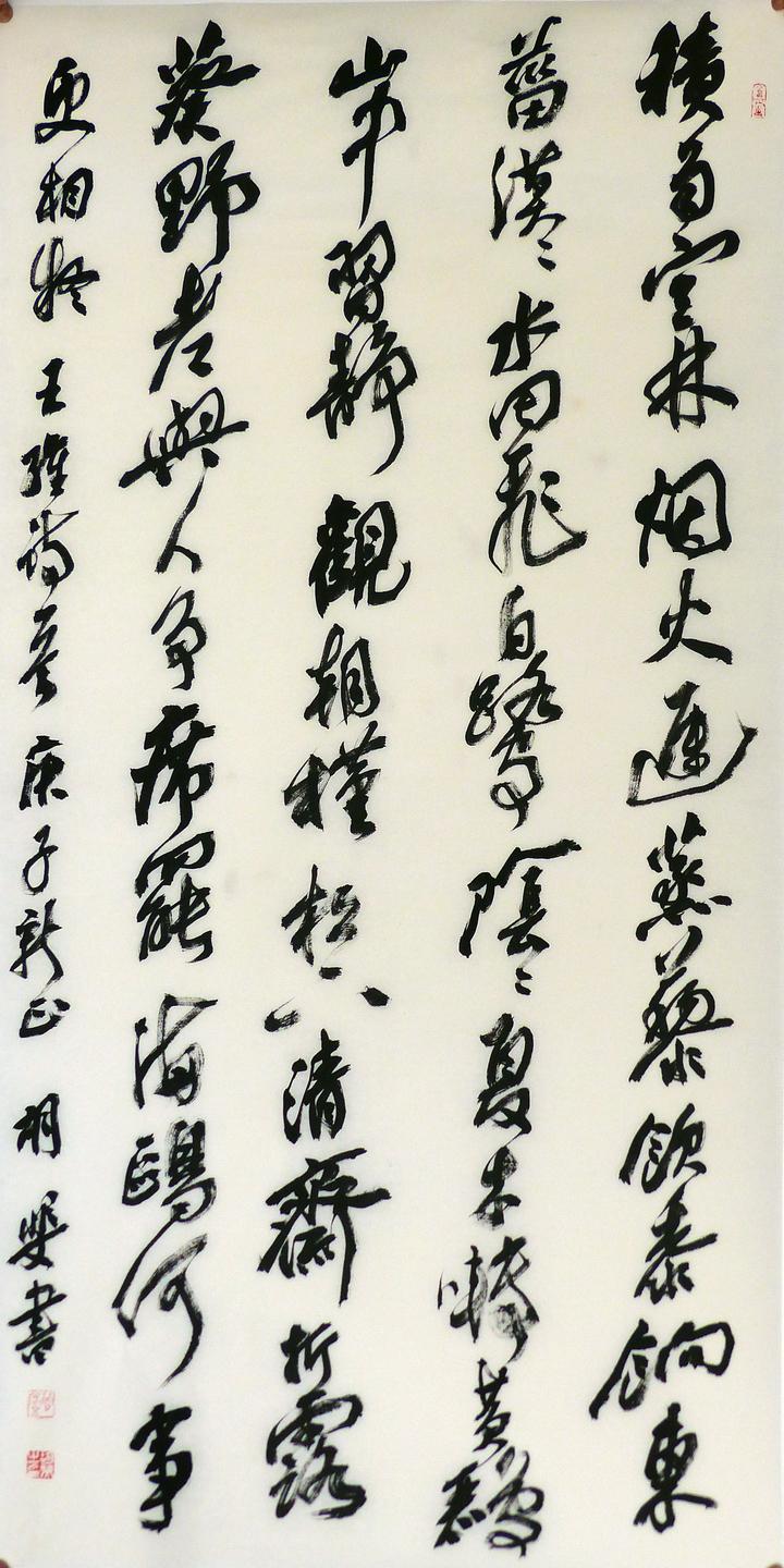 ??????? 書法像所有的藝術(shù)門類一樣,它最核心的因子就是通過書法作品來展示和表達(dá)胸中的自我性情。多年來,胡斐就是在自己的書法之旅中,不斷沉積,不斷打磨,把自己胸中的豪情自覺的融入其中。當(dāng)然,在創(chuàng)作中,他的作品所呈現(xiàn)的面目似乎更具說服力。在潔凈的宣紙上,他憑借著強(qiáng)大的裹鋒的突殺,縱橫交錯(cuò),叱咤風(fēng)云,把胸襟中的豪情揮灑的淋漓盡致。作為一個(gè)書法家,這種揮灑的過程是非常值得我們稱道的。其實(shí),相對于作品來說,這種過程更具感染力。我要說的是胡斐的作品和他的書寫過程有著驚人的一致性。從這一點(diǎn)來看,胡斐的書法移情是非常成功的。