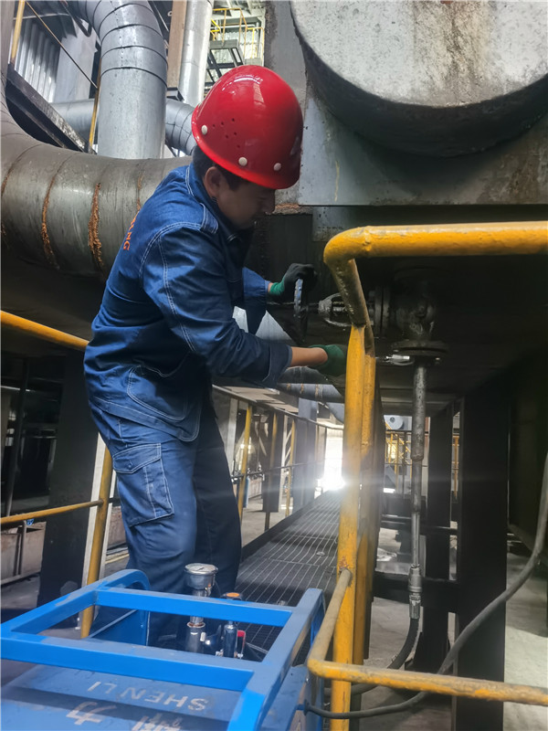 劉軒明在北區(qū)熱源廠檢查一號(hào)鍋爐漏點(diǎn)打壓。