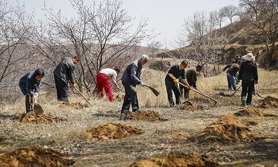 圖為西峰區(qū)彭原鎮(zhèn)草灘村群眾在荒山上挖坑準(zhǔn)備栽植油松。記者 李卿 攝