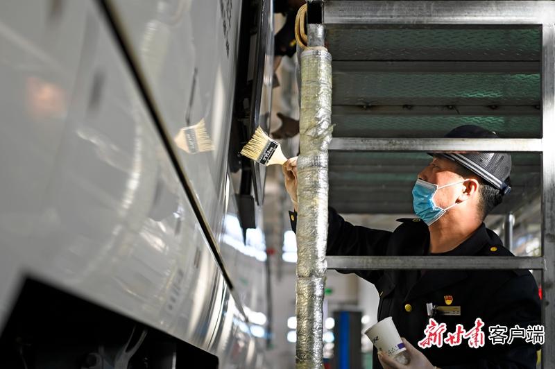 銀川動(dòng)車運(yùn)用所技術(shù)工正在對車門進(jìn)行保養(yǎng)。