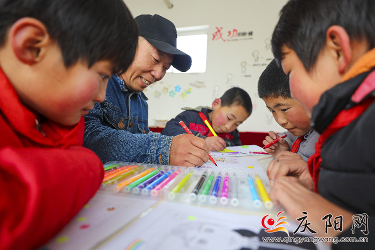 美術(shù)課上,教師王志斌和孩子們一起畫畫。