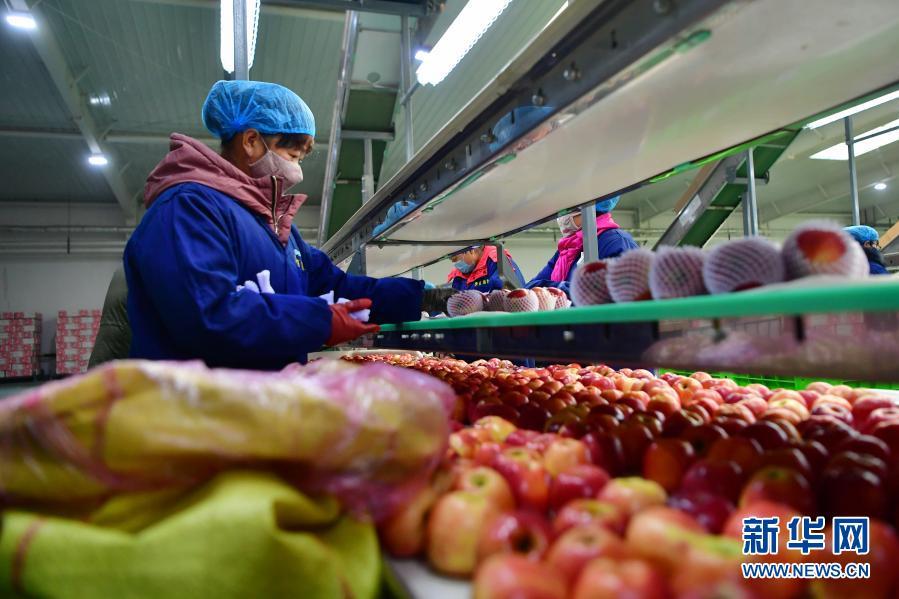 工作人員在甘肅省慶陽市寧縣慶陽海越冷鏈基地分揀蘋果(12月15日攝)。新華社記者 陳斌 攝