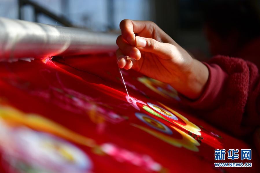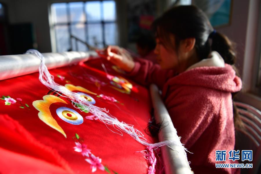 村民在甘肅省慶陽市群英香包有限公司巾幗扶貧車間刺繡(12月14日攝)。新華社記者 陳斌 攝