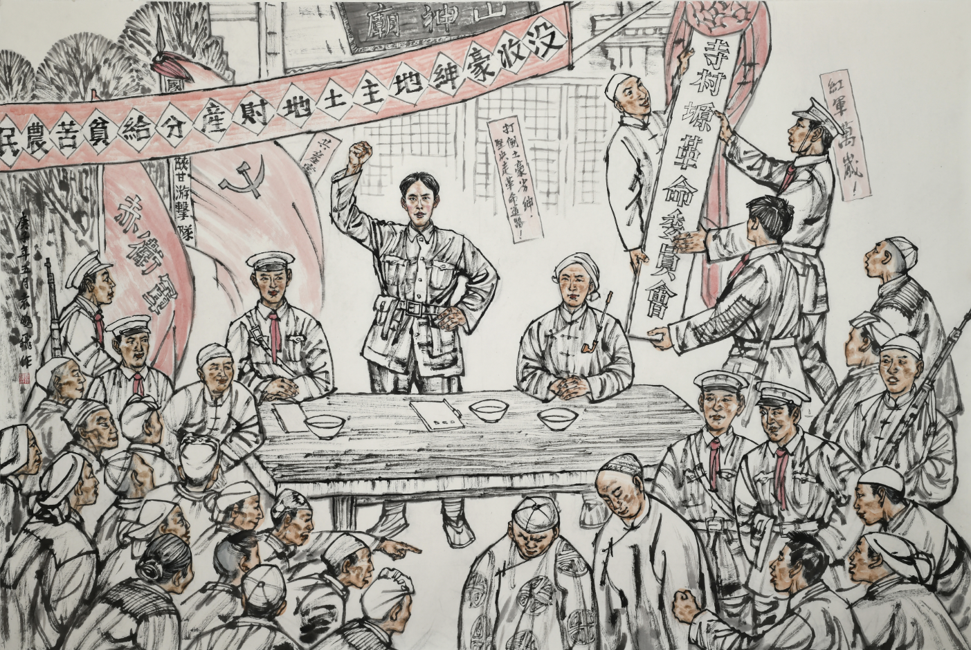 之后,游擊隊(duì)又在各村組織成立農(nóng)民聯(lián)合會、少先隊(duì)等組織。村設(shè)村會長,貧農(nóng)團(tuán)設(shè)團(tuán)長,赤衛(wèi)隊(duì)設(shè)隊(duì)長,各路團(tuán)總改為各路赤衛(wèi)隊(duì)。組織群眾沒收并分配了趙元亨家的糧食和牛羊。謝子長、高崗和楊重遠(yuǎn)等領(lǐng)導(dǎo)與游擊隊(duì)員一起,走村串戶,張貼標(biāo)語,訪貧問苦,宣傳紅軍的主張,宣講建立蘇維埃政權(quán)的意義,號召廣大貧苦農(nóng)民群眾開展抗糧、抗款和抗稅斗爭,組織起來斗地主、分田地。