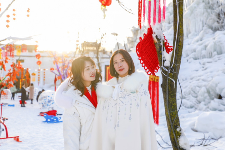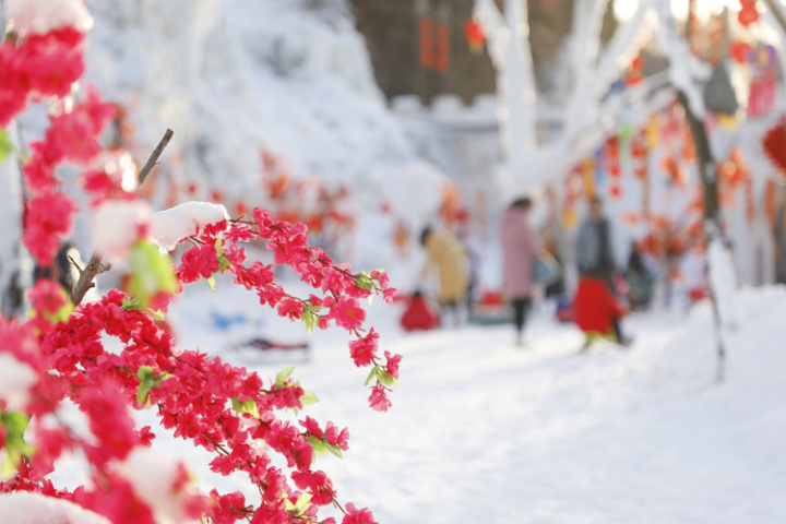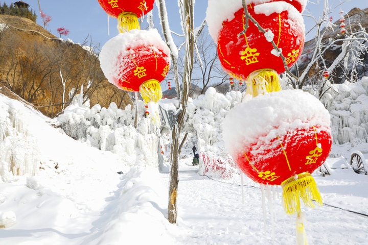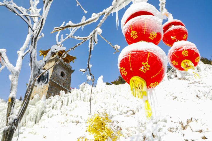 景點(diǎn)內(nèi)一片銀裝素裹,樹木上懸掛起大紅燈籠和中國(guó)結(jié),營(yíng)造起了濃濃年味。
