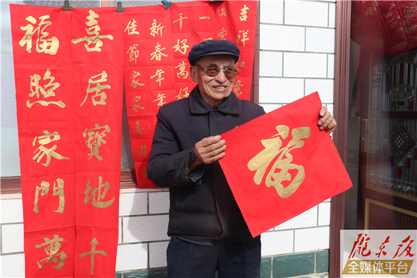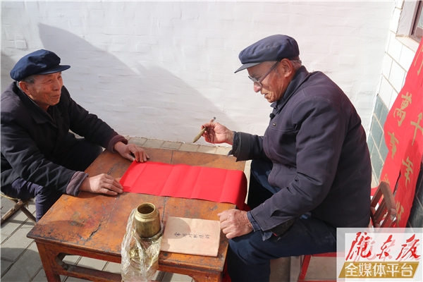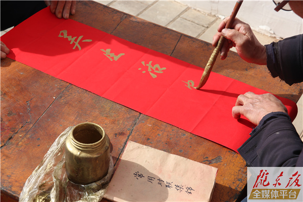 慶陽網(wǎng)訊(實(shí)習(xí)生 張倩) 戴上茶色老花鏡,擺上大號(hào)毛筆和一罐金粉,鋪開鮮艷的紅色紙張,80歲的合水縣固城鎮(zhèn)王昌寺村村民何尚奇正在一群鄰居的環(huán)繞下寫春聯(lián)。