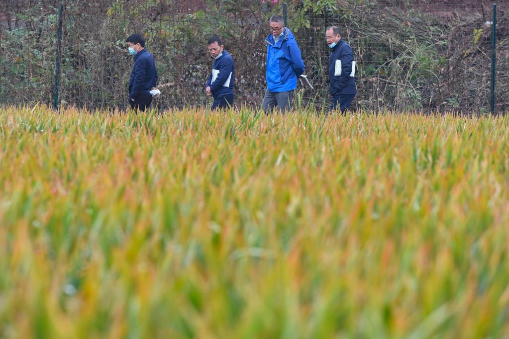 2020年11月2日,在第三代雜交水稻“叁優(yōu)一號(hào)”衡南試驗(yàn)示范基地,專(zhuān)家查看水稻生長(zhǎng)情況。新華社記者 陳澤國(guó) 攝