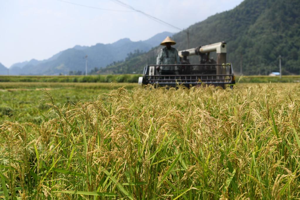 2019年8月20日,種植戶在位于貴州省岑鞏縣注溪鎮(zhèn)的國(guó)家級(jí)雜交水稻制種基地駕駛收割機(jī)收獲雜交水稻種子。新華社記者楊文斌攝