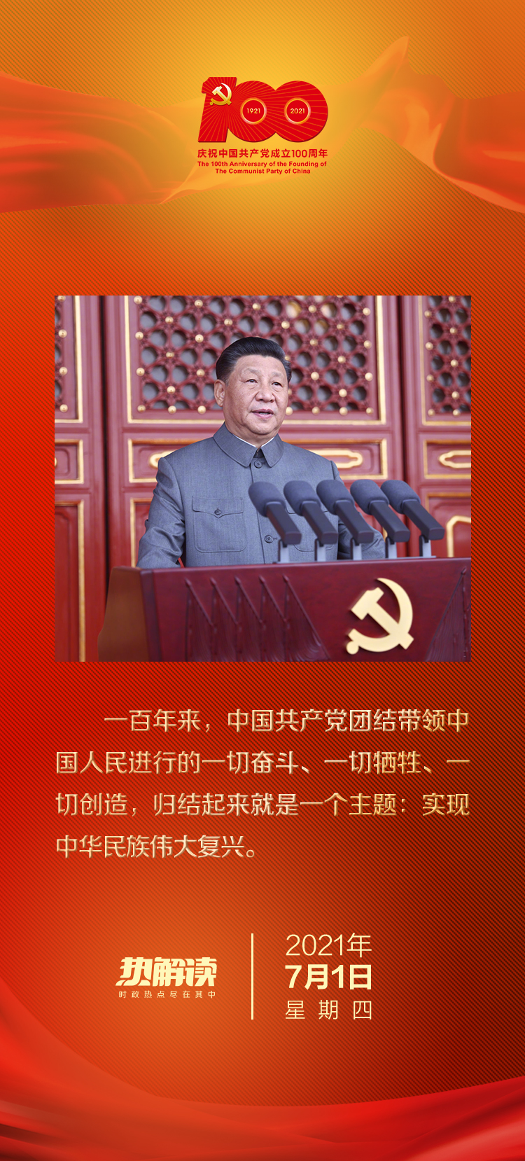 “一百年來,中國共產(chǎn)黨團(tuán)結(jié)帶領(lǐng)中國人民進(jìn)行的一切奮斗、一切犧牲、一切創(chuàng)造,歸結(jié)起來就是一個主題:實(shí)現(xiàn)中華民族偉大復(fù)興?!绷?xí)近平總書記的精辟論述,高度概括了中國共產(chǎn)黨百年歷史。
