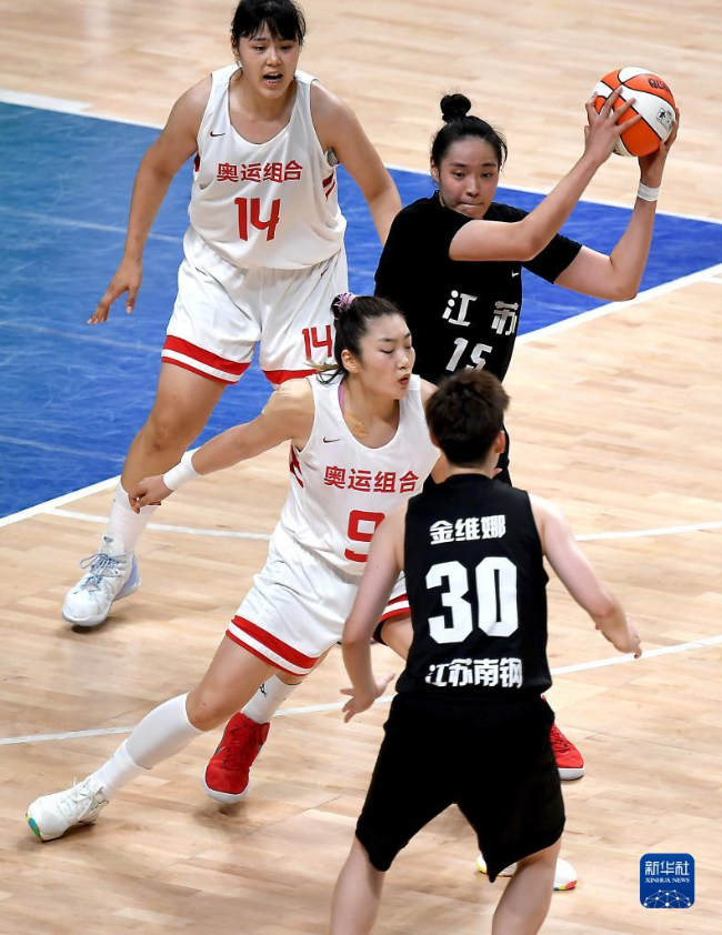 9月14日,江蘇隊球員許晨妍(后右)在比賽中控球。