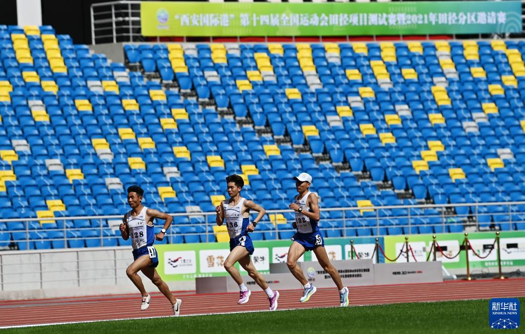 4月28日,在陜西西安舉行的第十四屆全國運(yùn)動(dòng)會(huì)田徑項(xiàng)目測(cè)試賽暨2021年田徑分區(qū)邀請(qǐng)賽(西北賽區(qū))男子組10000米決賽中,青海隊(duì)選手仁青東知布(左)以30分21秒44的成績(jī)獲得季軍。新華社記者李一博攝