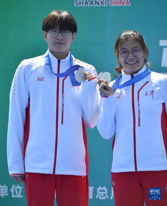 9月13日,天津隊(duì)選手唐浩洋(左)與教練員謝萌在頒獎(jiǎng)儀式上。