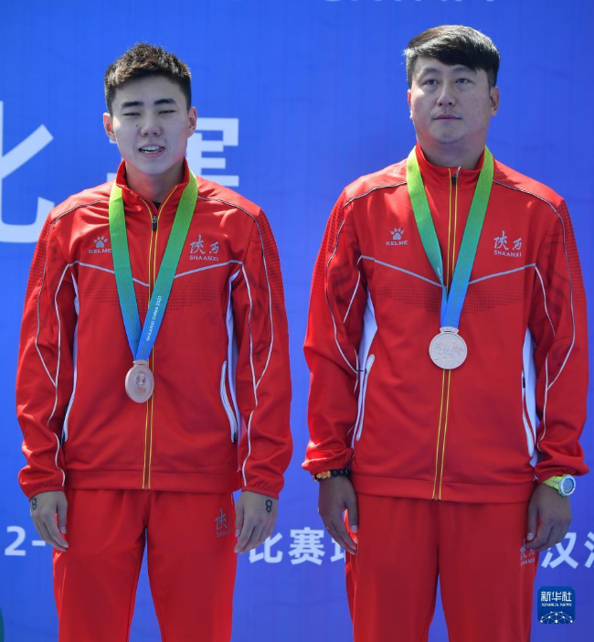 9月13日,陜西隊(duì)選手劉魯鵬(左)與教練員吳冬在頒獎(jiǎng)儀式上。