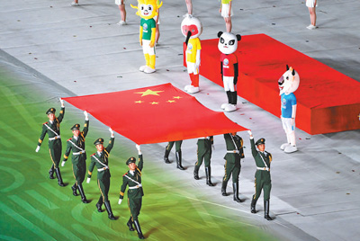 20時,儀仗隊員護(hù)擁五星紅旗健步走入體育場。會旗方陣過后,各代表團(tuán)依次入場,此起彼伏的歡呼、自信陽光的笑容,在體育場中飛揚。