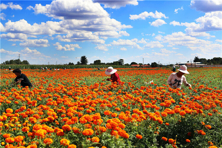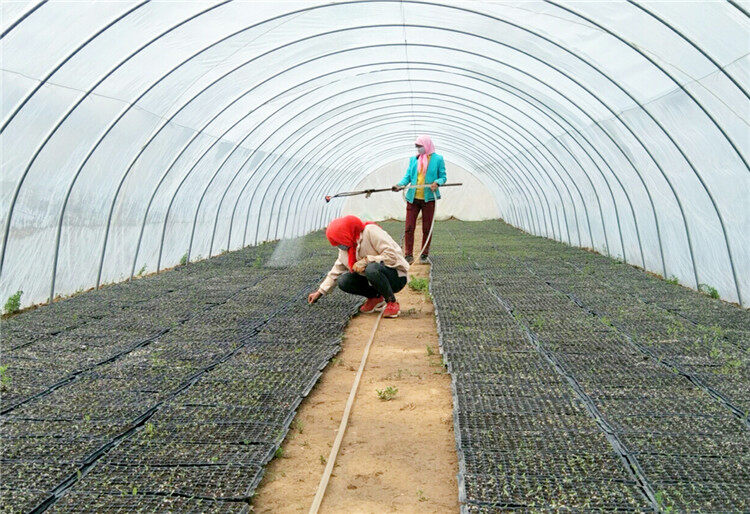 2020年4月27日,工人們正在環(huán)縣八珠鄉(xiāng)八珠塬村的60座規(guī)模化集中連片示范棚內(nèi)檢查萬(wàn)壽菊幼苗長(zhǎng)勢(shì),進(jìn)行拔草、灑水作業(yè)。
