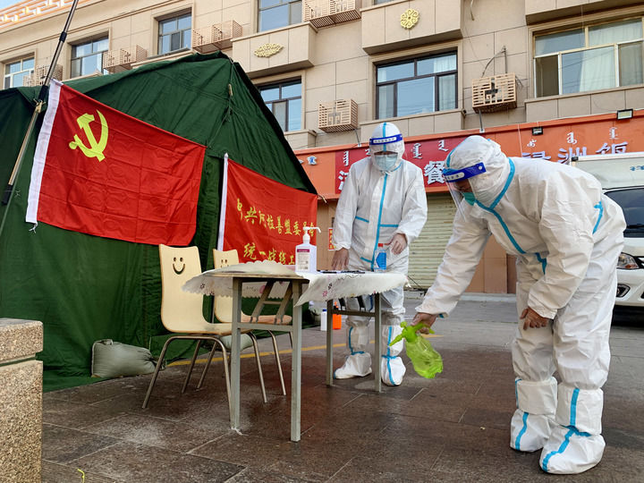 中共阿拉善盟委統(tǒng)戰(zhàn)部兩名黨員在額濟納旗一小區(qū)執(zhí)勤點消毒(2021年10月28日攝)。新華社記者 王靖 攝