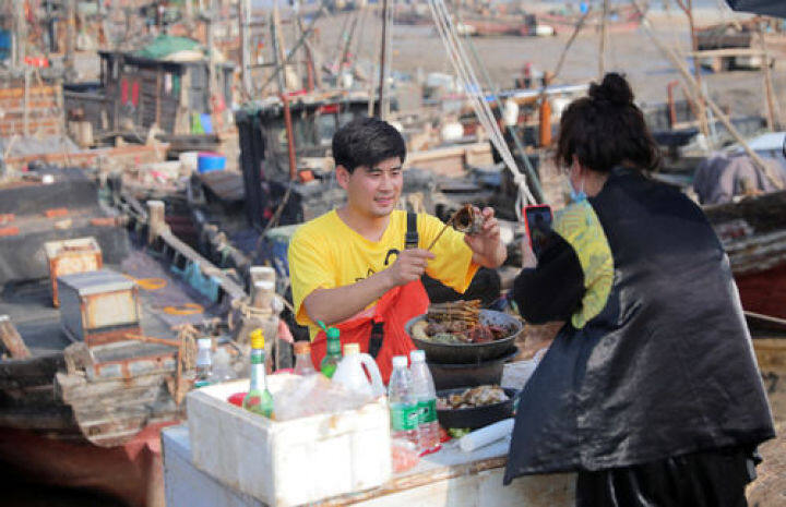 江蘇省連云港市海頭鎮(zhèn),“網(wǎng)紅主播”到漁船邊拍攝短視頻(2020年6月10日攝)。新華社記者李雨澤攝