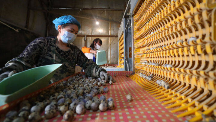 1月27日,在遼寧省遼陽縣壯大畜牧養(yǎng)殖專業(yè)合作社,工人在收集分揀鵪鶉蛋。新華社記者楊青攝
