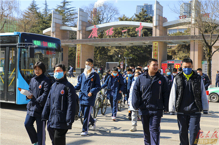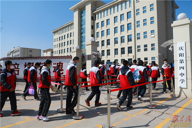 ↑慶陽(yáng)第四中學(xué)的學(xué)生有序步入校園。