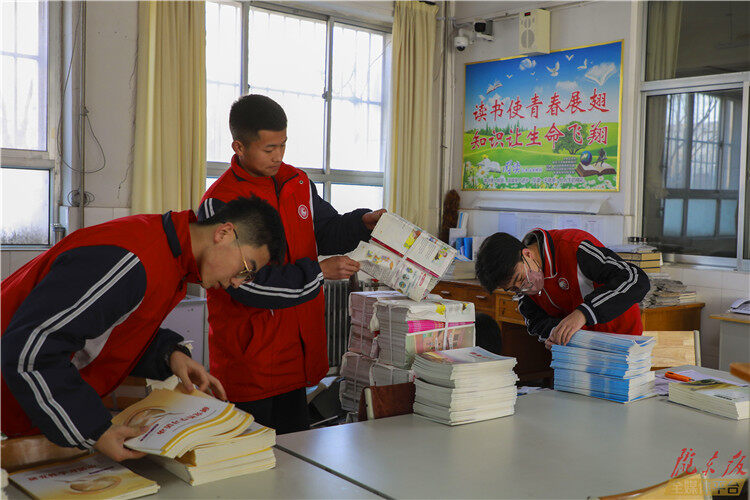 ↑慶陽(yáng)第三中的學(xué)生正在分發(fā)新學(xué)期教材。