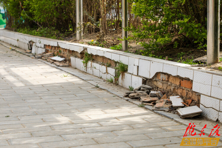 ↑慶陽汽車北站門前,綠化帶一側(cè)墻體破損嚴重。