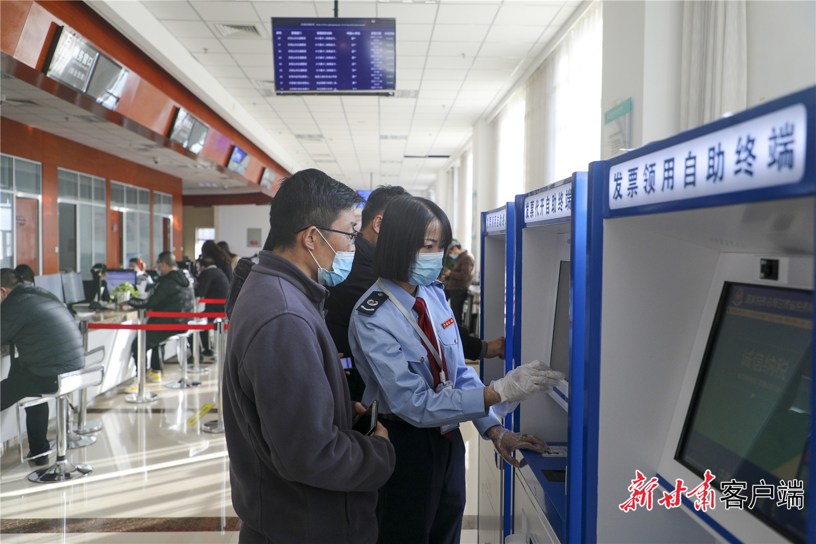 稅務(wù)部門工作人員指導(dǎo)群眾在發(fā)票領(lǐng)用自助終端開取發(fā)票。新甘肅·甘肅日?qǐng)?bào)通訊員 俄少飛