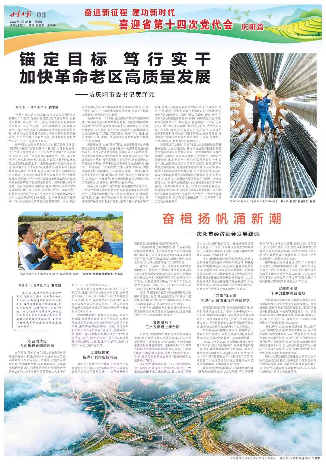 黃澤元說(shuō),慶陽(yáng)市舉全市之力打贏了脫貧攻堅(jiān)戰(zhàn),“兩不愁三保障”全面實(shí)現(xiàn),8個(gè)縣(區(qū))全部脫貧摘帽,570個(gè)貧困村全部退出,61.05萬(wàn)農(nóng)村貧困人口全部脫貧,與全國(guó)、全省一道全面建成小康社會(huì)。2021年全市地區(qū)生產(chǎn)總值突破850億元,財(cái)政收入達(dá)到65.38億元,達(dá)到歷史最高水平。全面建成千萬(wàn)噸油氣生產(chǎn)基地,國(guó)內(nèi)首個(gè)千萬(wàn)千瓦級(jí)“風(fēng)光儲(chǔ)輸”多能互補(bǔ)綜合能源基地啟動(dòng)建設(shè),油氣煤、風(fēng)光電齊頭并進(jìn)開(kāi)發(fā)的新局面初步形成。牛羊豬雞果菜草藥八大農(nóng)業(yè)主導(dǎo)產(chǎn)業(yè)集群發(fā)展態(tài)勢(shì)強(qiáng)勁,“一縣一業(yè)”格局初步形成,現(xiàn)代絲路寒旱農(nóng)業(yè)優(yōu)勢(shì)特色產(chǎn)業(yè)走在全省前列。銀西高鐵、甜永高速等一大批交通基礎(chǔ)設(shè)施項(xiàng)目建成,使慶陽(yáng)從陜甘寧交界處偏遠(yuǎn)之地的區(qū)位劣勢(shì),轉(zhuǎn)變?yōu)槿。▍^(qū))區(qū)域性中心和黃金節(jié)點(diǎn)的區(qū)位優(yōu)勢(shì)。將黃河水引上董志塬,改變了慶陽(yáng)人過(guò)去喝苦咸水的歷史。全市森林覆蓋率達(dá)到26.15%,天藍(lán)地綠水清的新慶陽(yáng)更加宜居。同時(shí),城鄉(xiāng)居民人均可支配收入增速連續(xù)多年跑贏經(jīng)濟(jì)增速,補(bǔ)齊了教育、文化、衛(wèi)生等民生領(lǐng)域弱項(xiàng)短板,辦成了一批群眾看得見(jiàn)、摸得著的實(shí)事好事。
