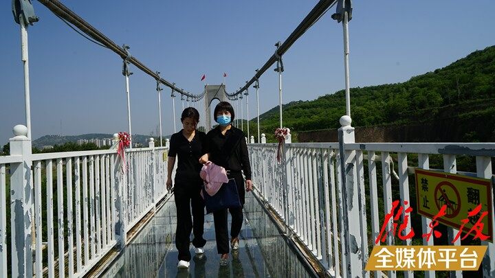 游客在慶城縣藥王洞養(yǎng)生小鎮(zhèn)的玻璃天橋上游玩。隴東報全媒體記者 路世玲 攝