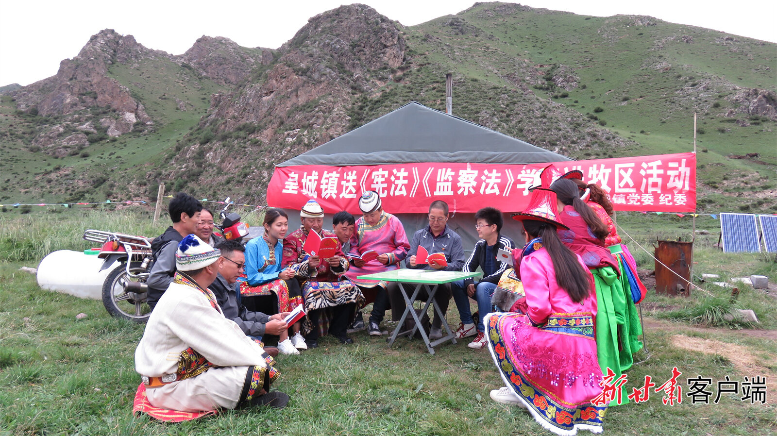 肅南裕固族自治縣紀檢監(jiān)察干部向農(nóng)牧民宣講《中華人民共和國憲法》和《中華人民共和國監(jiān)察法》。省紀委監(jiān)委供圖