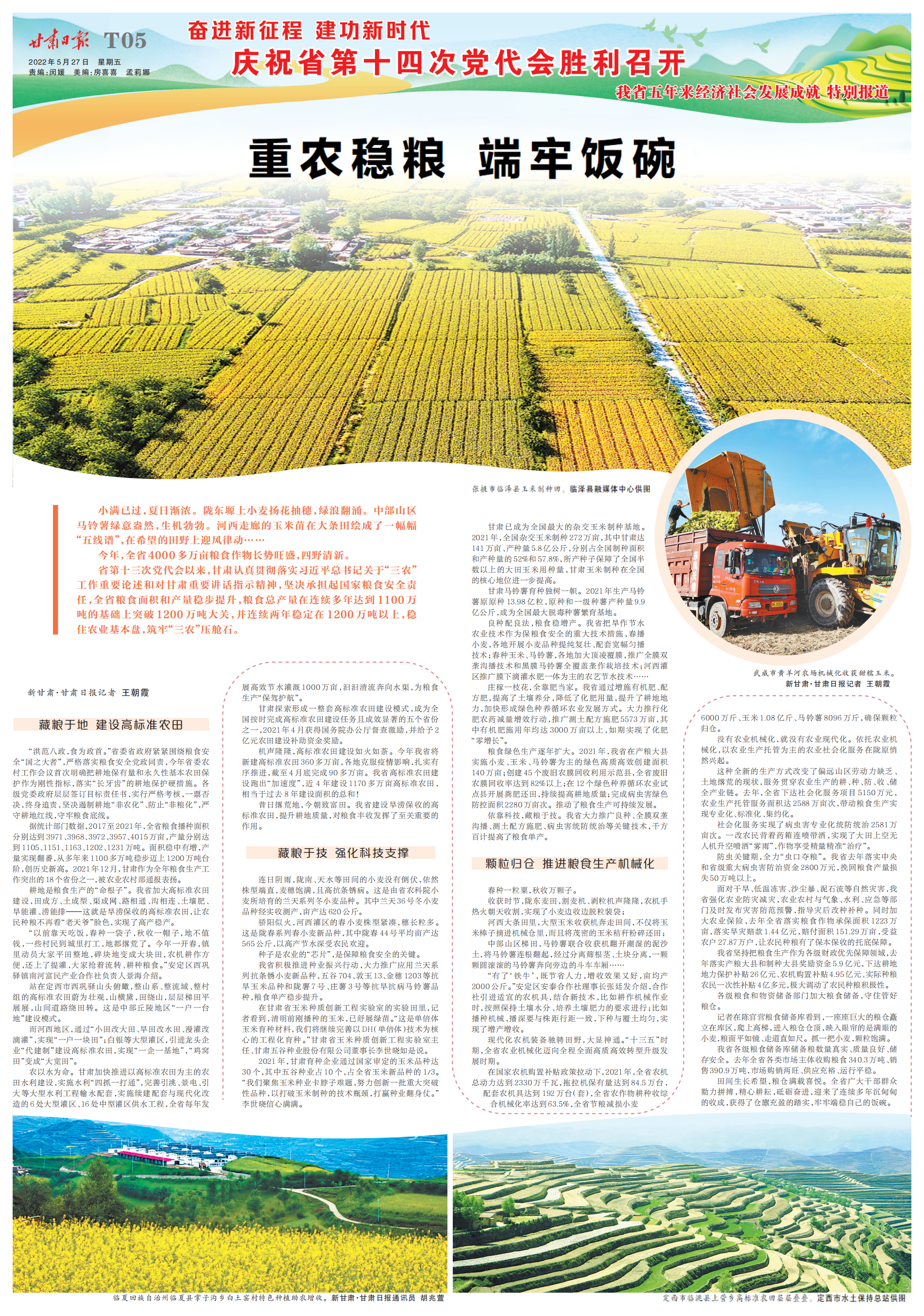 省第十三次黨代會(huì)以來(lái),甘肅認(rèn)真貫徹落實(shí)習(xí)近平總書記關(guān)于“三農(nóng)”工作重要論述和對(duì)甘肅重要講話指示精神,堅(jiān)決承擔(dān)起國(guó)家糧食安全責(zé)任,全省糧食面積和產(chǎn)量穩(wěn)步提升,糧食總產(chǎn)量在連續(xù)多年達(dá)到1100萬(wàn)噸的基礎(chǔ)上突破1200萬(wàn)噸大關(guān),并連續(xù)兩年穩(wěn)定在1200萬(wàn)噸以上,穩(wěn)住農(nóng)業(yè)基本盤,筑牢“三農(nóng)”壓艙石。