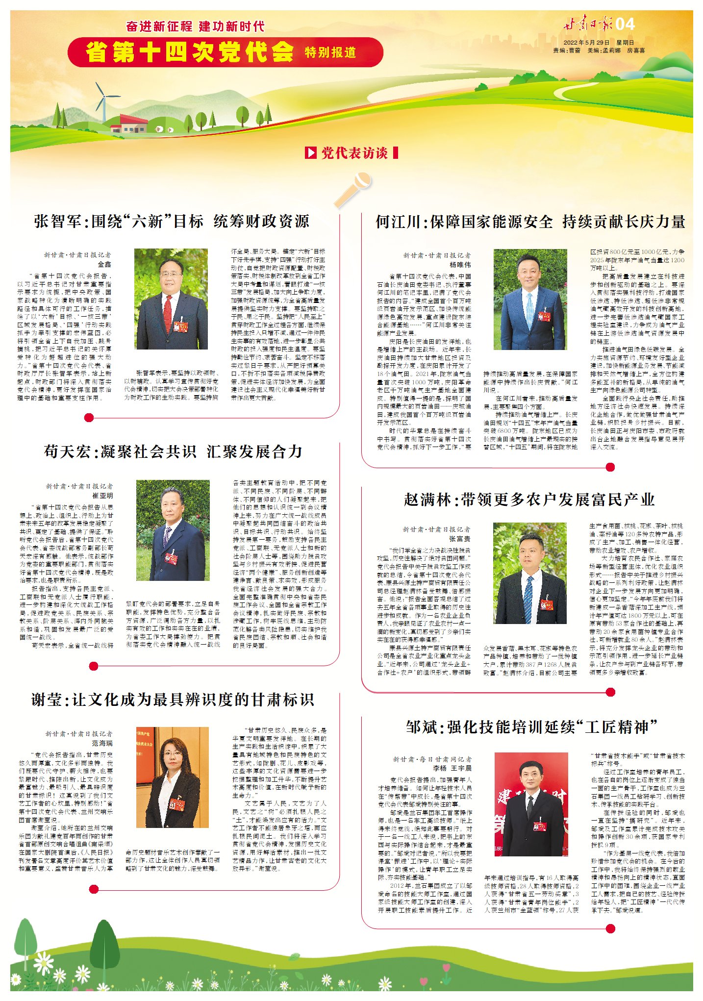 “省第十四次黨代會報告,以習近平總書記對甘肅重要指示要求為統(tǒng)攬,把中央政策、國家戰(zhàn)略轉(zhuǎn)化為清晰明確的實踐路徑和具體可行的工作任務(wù),描繪了以‘六新’目標、‘一核三帶’區(qū)域發(fā)展格局、‘四強’行動實踐抓手為牽引支撐的宏偉藍圖,必將引領(lǐng)全省上下自我加壓、跳身摘桃,把習近平總書記的關(guān)懷厚愛轉(zhuǎn)化為趕超進位的強大動力?!笔〉谑拇吸h代會代表、省財政廳廳長張智軍表示,站上新起點,財政部門將深入貫徹落實黨代會精神,更好發(fā)揮在國家治理中的基礎(chǔ)和重要支柱作用。