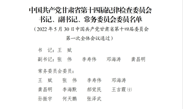 中國共產(chǎn)黨甘肅省第十四屆紀律檢查委員會書記、副書記、常務委員會委員名單