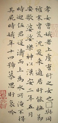 書法作品,臨曹娥碑。碑文上記載了浙江百姓們在五月初五紀(jì)念濤神伍子胥的情景。也許沒人想得到,對悲劇人物伍子胥的紀(jì)念活動(dòng)又引出了另一個(gè)關(guān)于端午節(jié)的悲劇傳說。