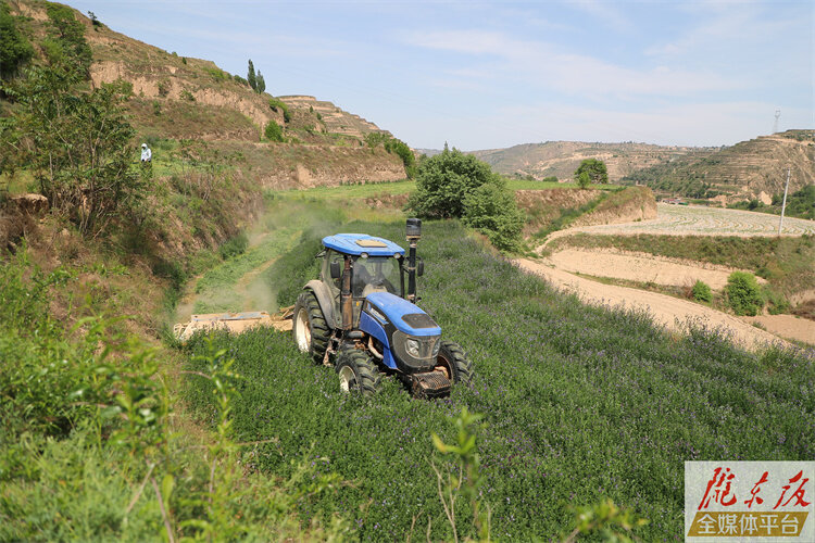 時(shí)下,正值紫花苜蓿頭茬收割的黃金時(shí)期,環(huán)縣曲子鎮(zhèn)西溝村萬(wàn)畝紫花苜蓿迎來(lái)頭茬收割。在一層層高低錯(cuò)落的梯田內(nèi),收割機(jī)轟鳴著來(lái)回穿梭,一行行苜蓿齊刷刷倒下,畫出一道道綠色軌跡。經(jīng)過(guò)收割、晾曬、打捆等作業(yè)流程后,一捆捆苜蓿將成為湖羊的優(yōu)質(zhì)“口糧”。