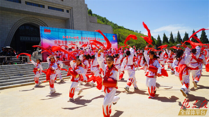 ▲游客在華池縣大鳳川軍民大生產(chǎn)紀(jì)念館前合唱。