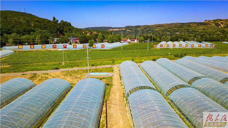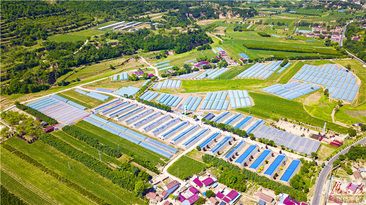 ↑6月15日,俯瞰合水縣固城川設(shè)施瓜菜生產(chǎn)基地,棗樹園田園綜合體位于其中。