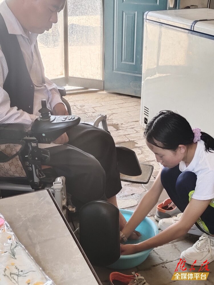 趙潔的家庭非常特殊,她有一位身患?xì)埣驳母赣H,下肢癱瘓,生活無(wú)法自理,常年以輪椅為伴。由于家庭的特殊性,全家僅靠母親王曉萍支撐,一家五口人的生活全部落在了一個(gè)小超市里。趙潔是姊妹中的老大,每周走學(xué)校之前都要幫媽媽料理好家務(wù),打理好爸爸的衣用品及輪椅,床頭倒一杯熱水,才能放心離去。周五一放學(xué)便以最快的速度回家,幫媽媽干活,給家人做飯,飯后,換洗爸爸衣物,給爸爸洗腳......這種困難的生活環(huán)境養(yǎng)成了她有擔(dān)當(dāng)、有責(zé)任、獨(dú)立自主的堅(jiān)強(qiáng)性格,小小的身軀上有了大人的堅(jiān)韌。