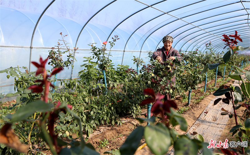 西峰區(qū)后官寨鎮(zhèn)司官寨村村民修剪大棚里的月季。