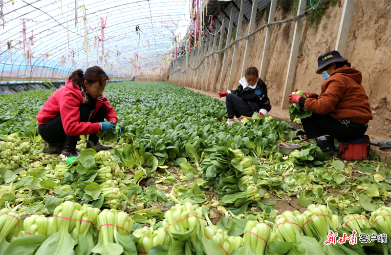 西峰區(qū)肖金設(shè)施蔬菜基地種植戶采收油菜。