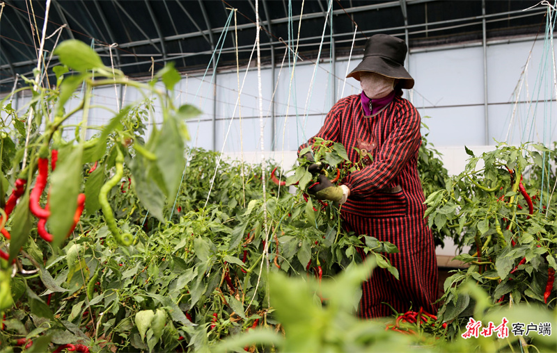西峰區(qū)什社鄉(xiāng)李嶺村村民采摘大棚辣椒。