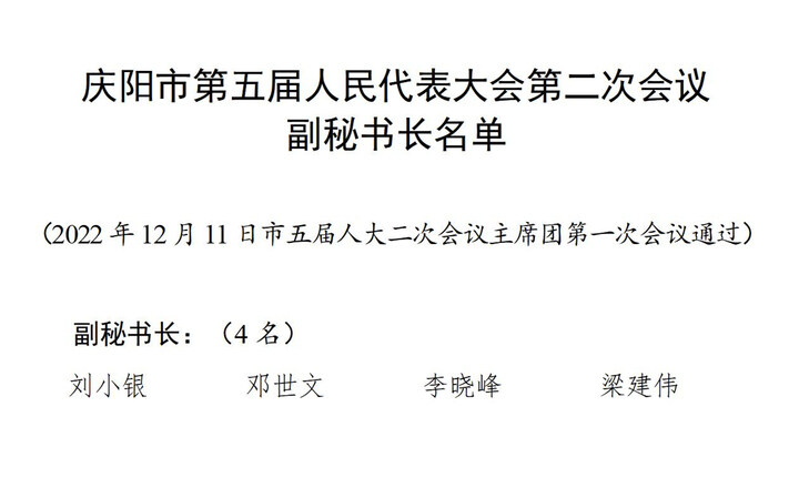 【受權(quán)發(fā)布】慶陽(yáng)市第五屆人民代表大會(huì)第二次會(huì)議副秘書長(zhǎng)名單