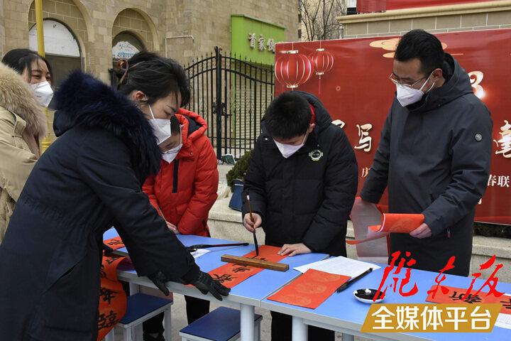 在書法老師的指導(dǎo)下,同學(xué)們鋪展紅紙,凝神聚氣,揮毫潑墨。一停一頓、一起一落間,一幅幅風(fēng)格多樣、寓意吉祥的春聯(lián)和“?!弊衷诠P下綻放。“春歸大地人間暖,福降神州喜臨門”“一室平安增百福,闔家歡樂納千祥”……孩子們的一手好字引得市民連連稱贊。