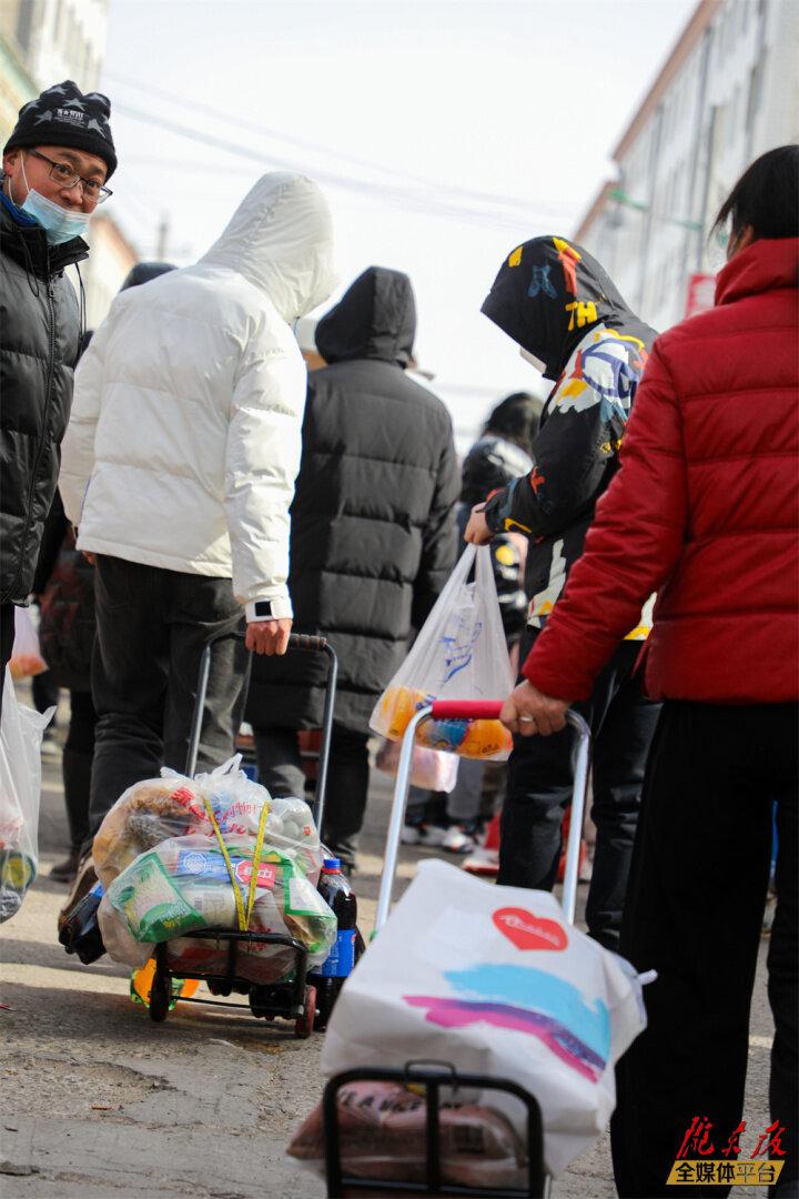 人們用小推車運(yùn)輸購買的年貨。