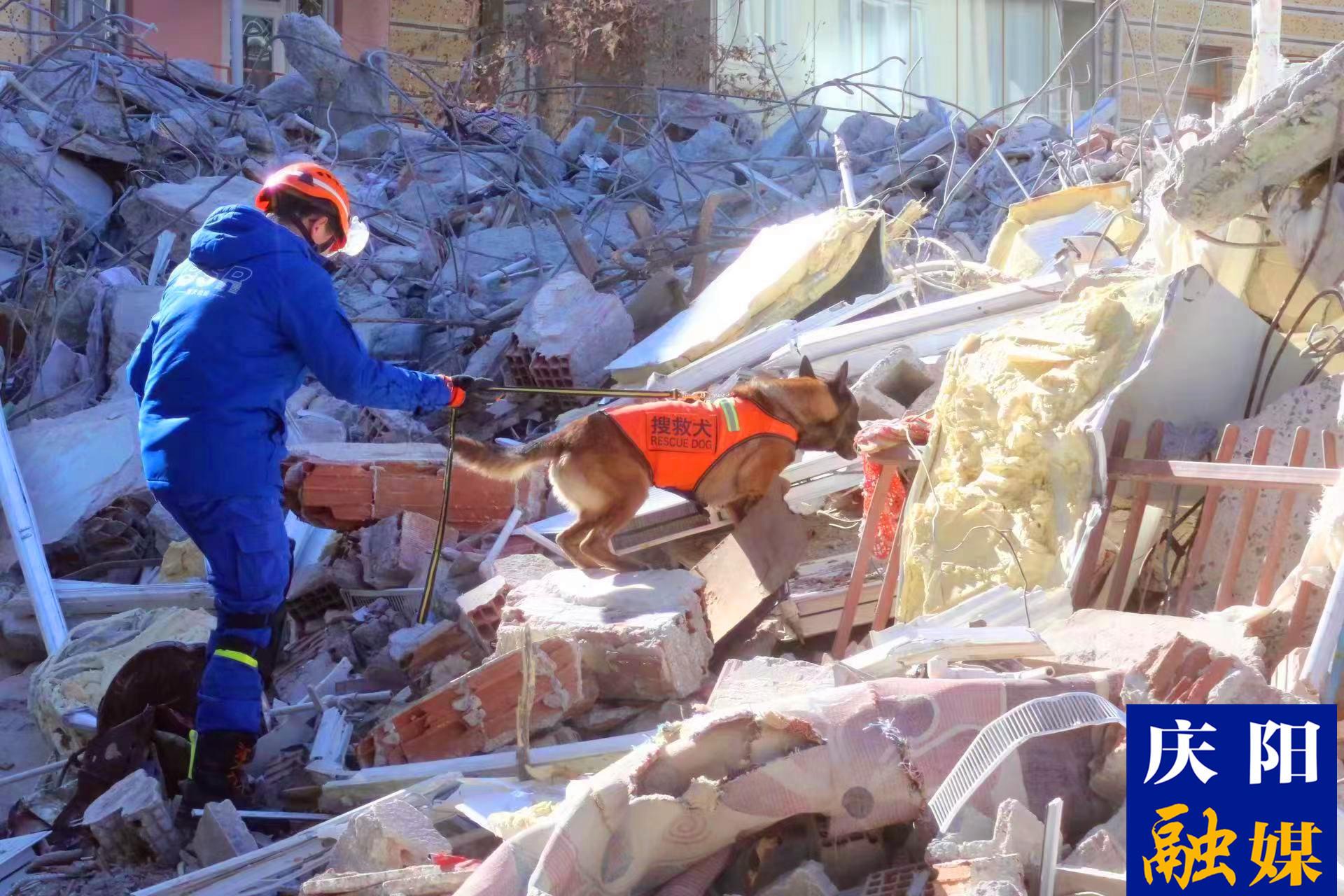藍(lán)天救援隊(duì)隊(duì)員帶著搜救犬進(jìn)行搜救。