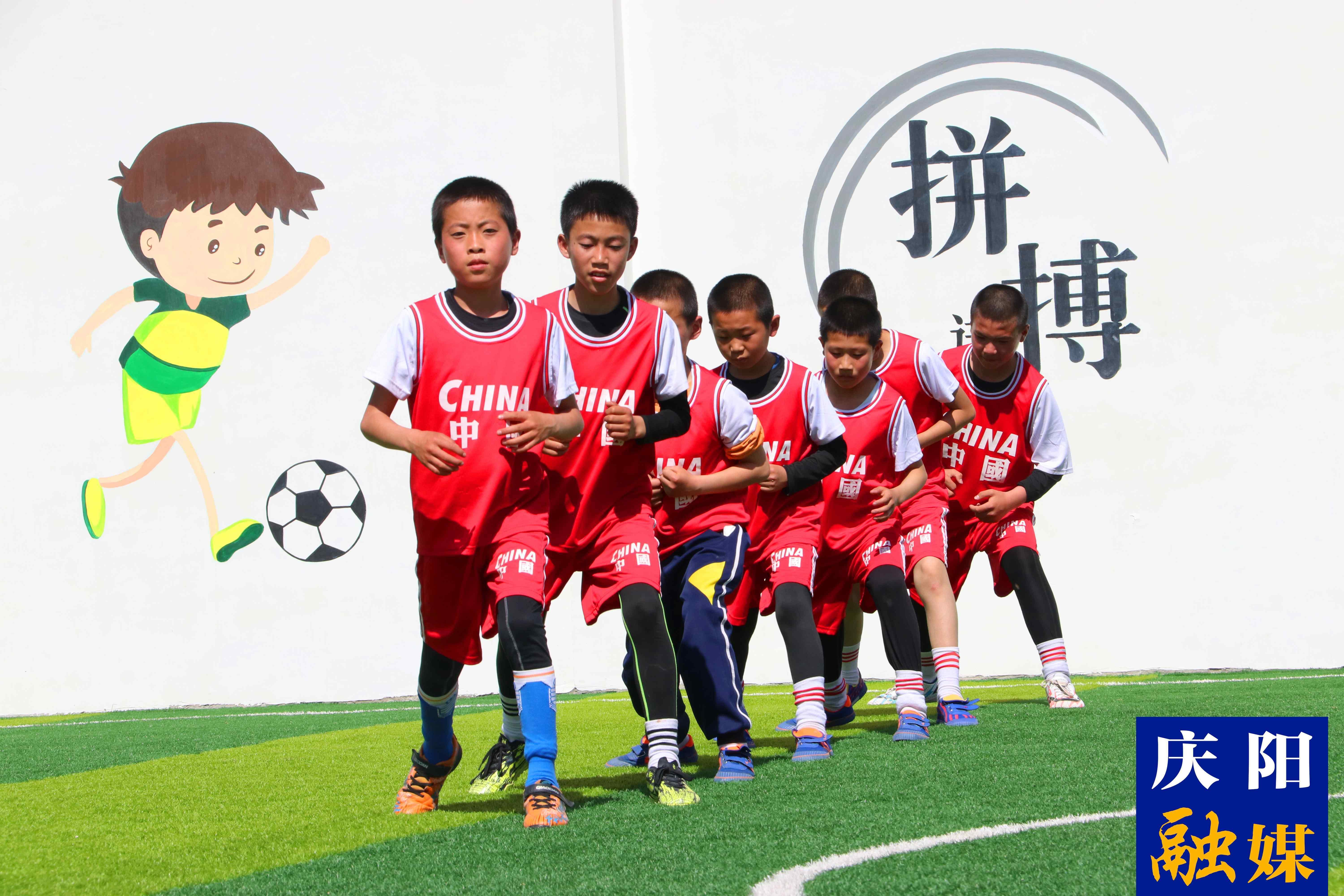 西峰區(qū)彭原鎮(zhèn)趙溝畎小學(xué)足球隊隊員正在訓(xùn)練。