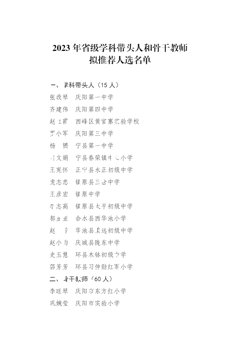 根據(jù)《甘肅省教育廳關于開展2023年甘肅省中小學學科帶頭人和骨干教師評選認定活動的通知》要求,經(jīng)教師個人申報,各縣(區(qū))教育局、市直有關學校推薦,市教育局審核確定,擬推薦張改琴等15名同志為2023年省級學科帶頭人人選,李旺琴等60名同志為省級骨干教師人選?,F(xiàn)對推薦人選名單予以公示,接受廣大群眾的監(jiān)督。如發(fā)現(xiàn)有影響公示對象推薦的問題,可通過電話、來信、面談等形式向慶陽市教育局反映。